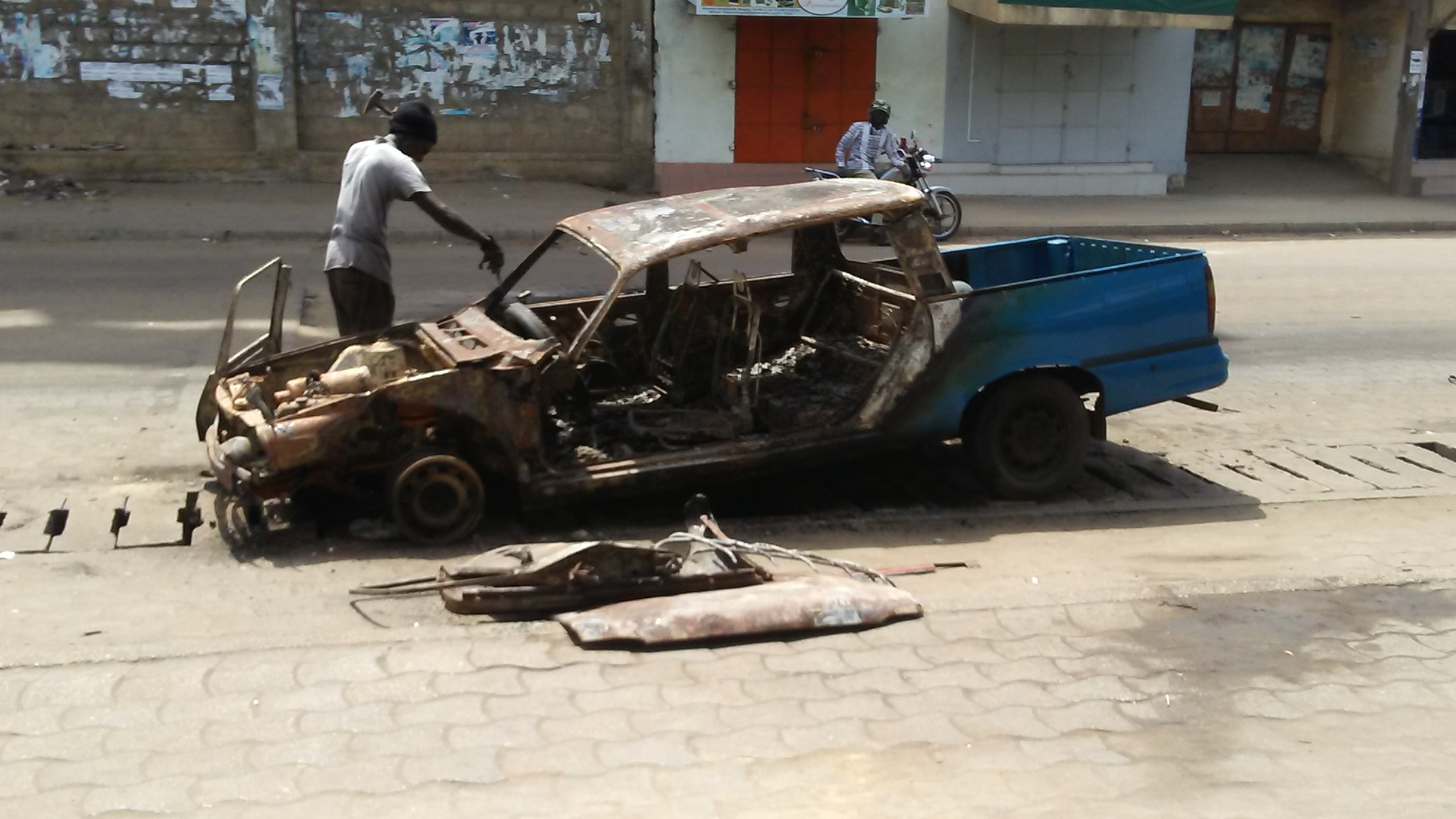 During our stay in Avepozo, we witnessed 3 days of demonstrations, two consecutive days and one a couple of days later. During the manifestations were not able to leave the house because everyone said it was too dangerous. We saw tires burning on the main thoroughfare, the N2, about two blocks from the house we stayed in. If you have never seen a tire burning, it burns completely, creating a lot of smoke and it leaves soot in a large radius around it, up to at least two blocks away. It is unfortunate for the environment. I am sure that burnt tires have a high level of toxicity and that soot must have gotten all over the agricultural plots everywhere in Avepozo, and in children’s food. I saw one burnt car although I was told many were burnt.